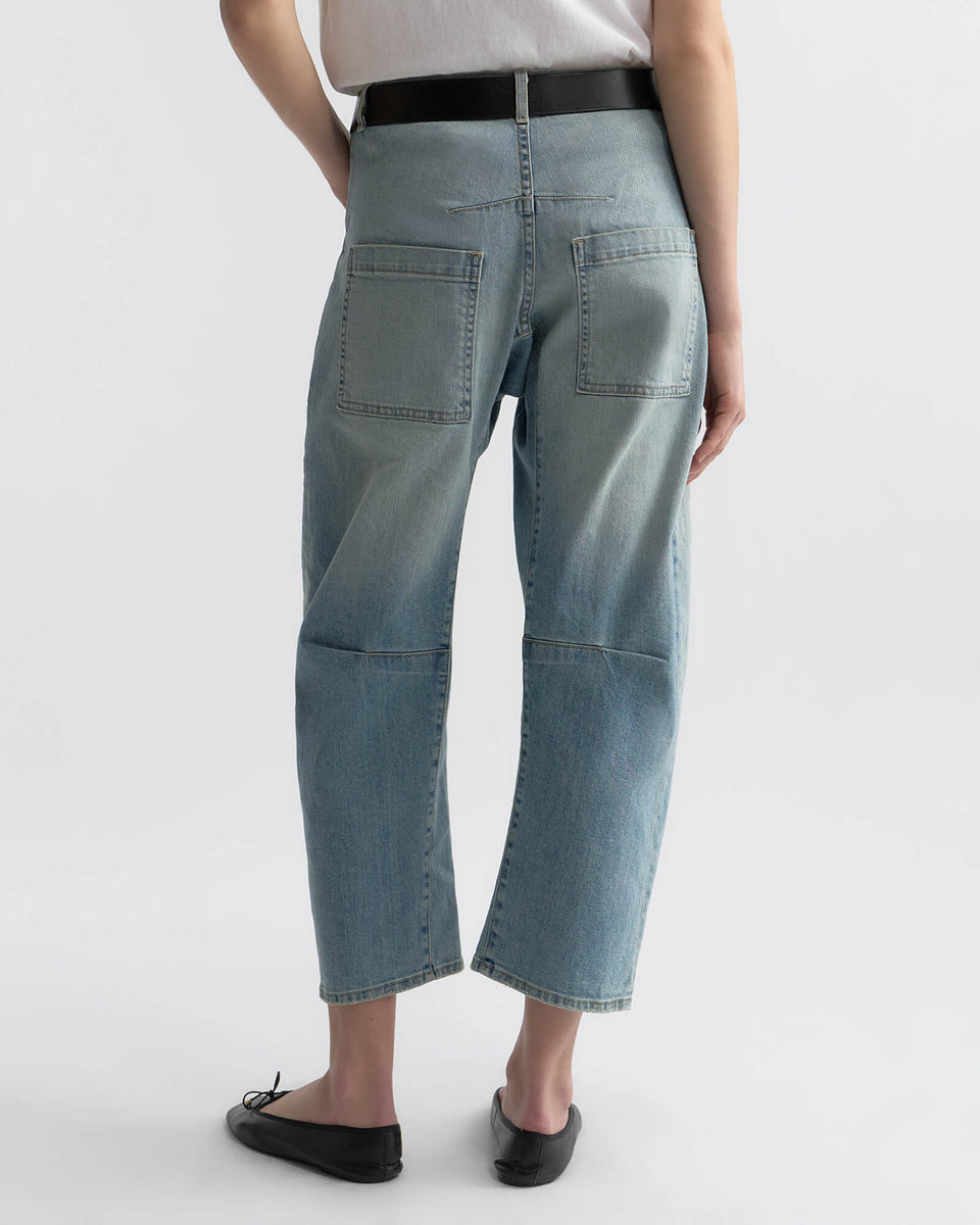 A mid-rise bow-leg jean born from vintage workwear and reimagined in premium Japanese stretch denim. The Shon is cut with relaxed ease through the leg, shaped by a curved inseam and articulated seam detail at the knees—balancing structure with fluidity for a silhouette that is utilitarian, sexy, easy, and transformative.