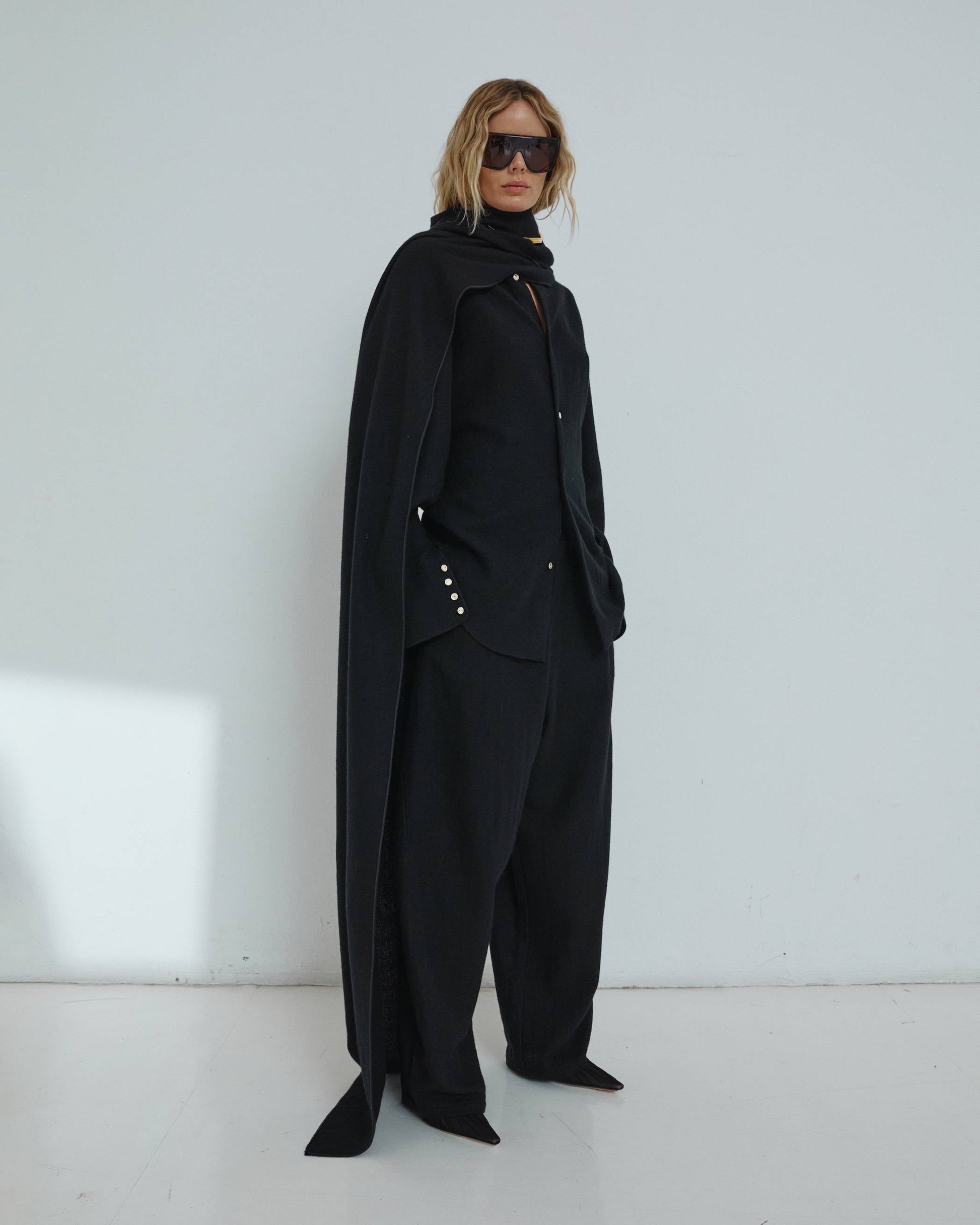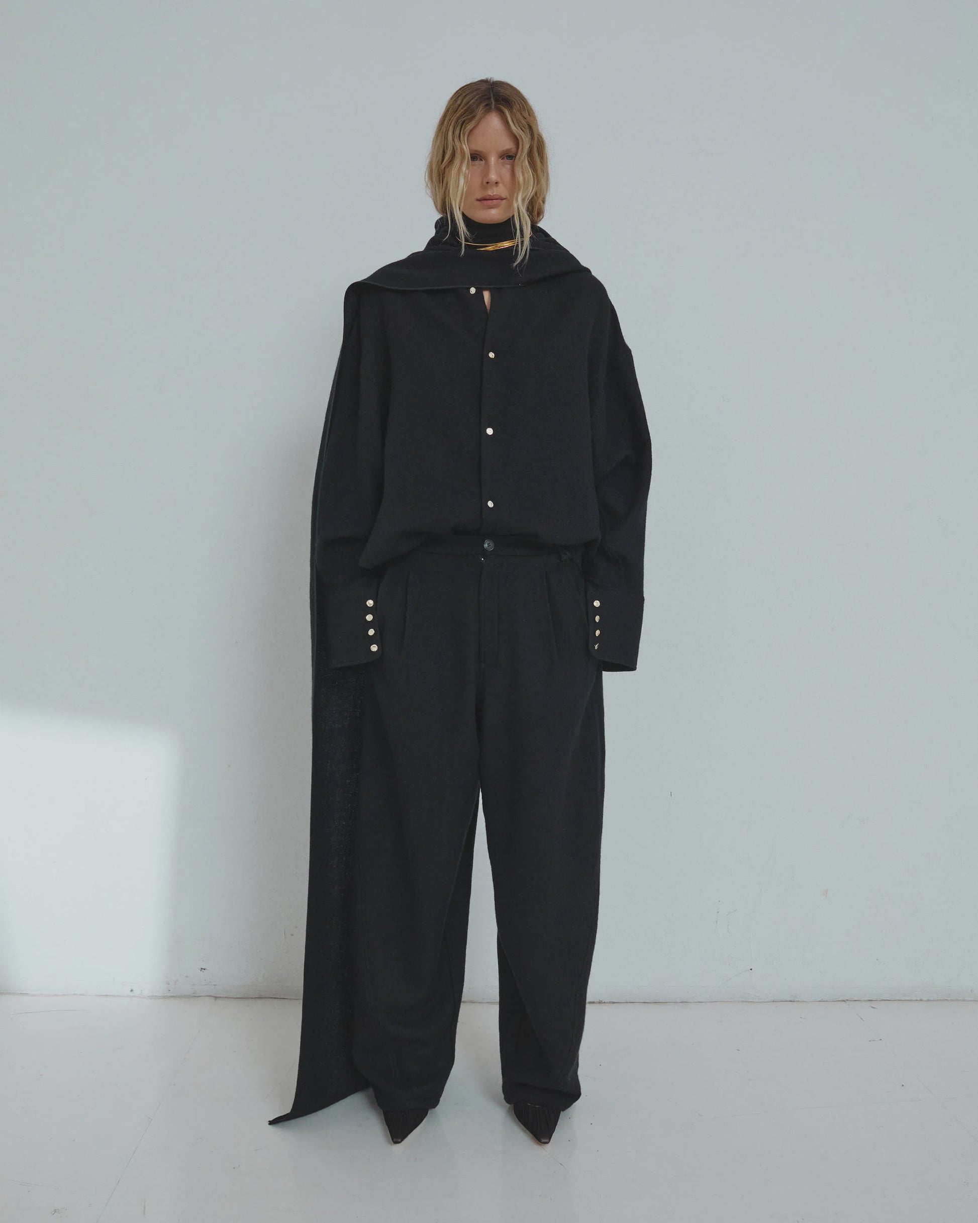 PHEBE wide-leg pants in black Japanese light wool chambray.