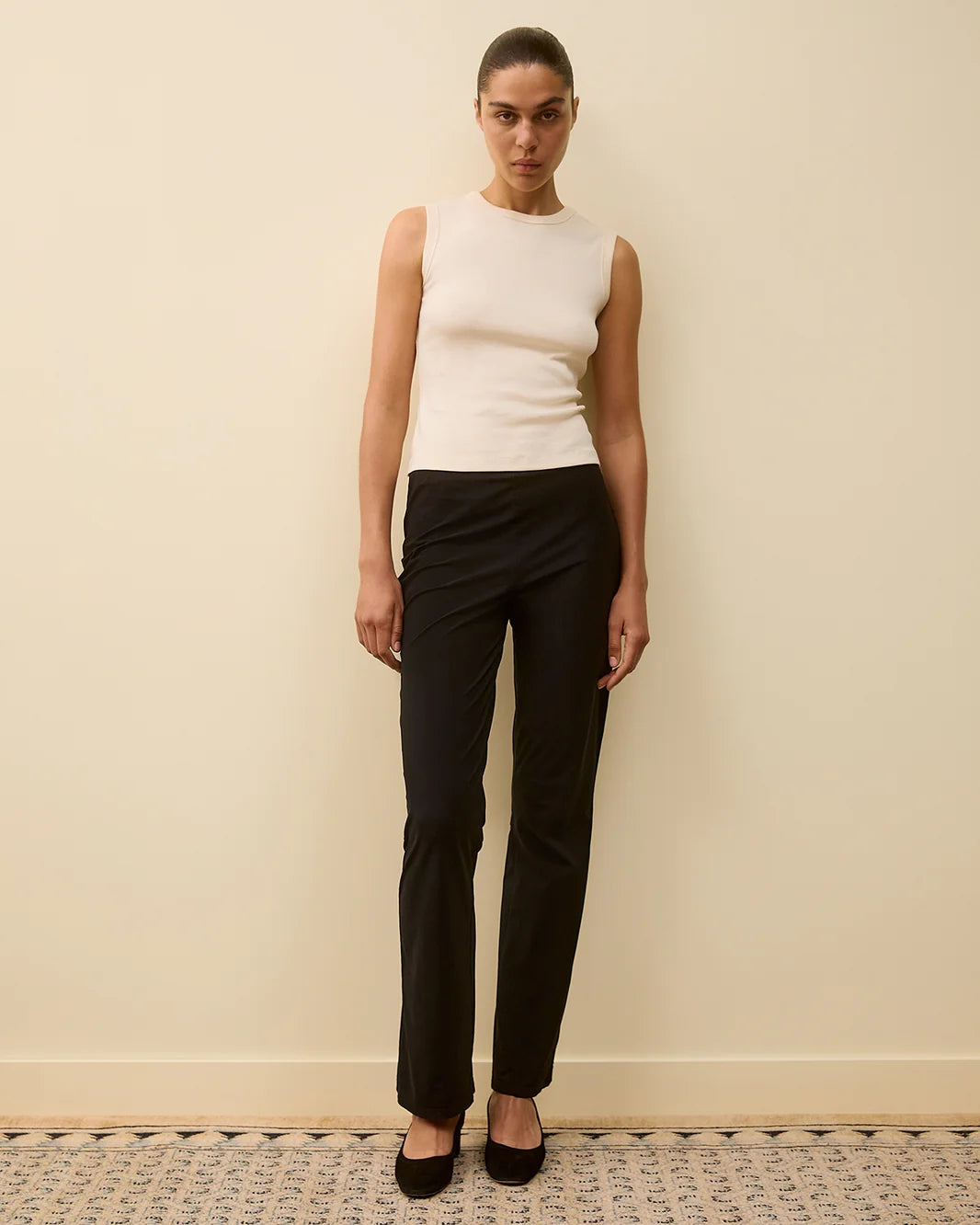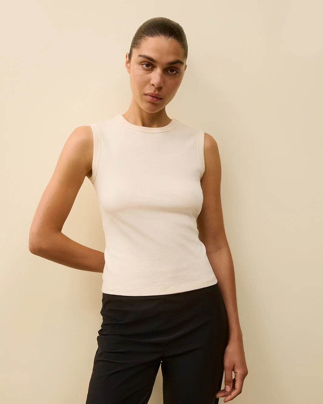 A fitted crew neck tank with scooped-out armholes and a cut-off seam on the back, crafted from medium-weight organic cotton rib. Layer or wear on its own.