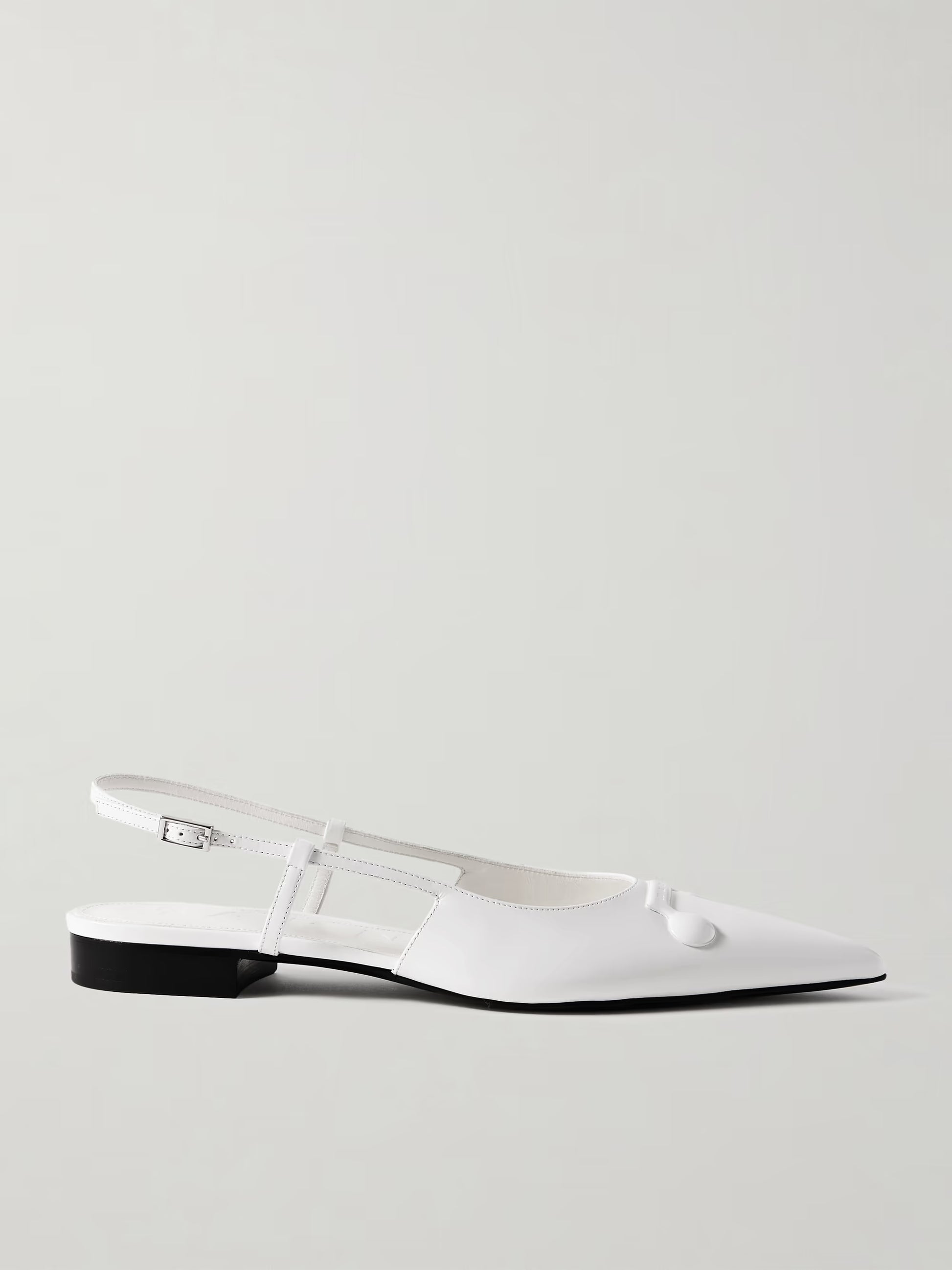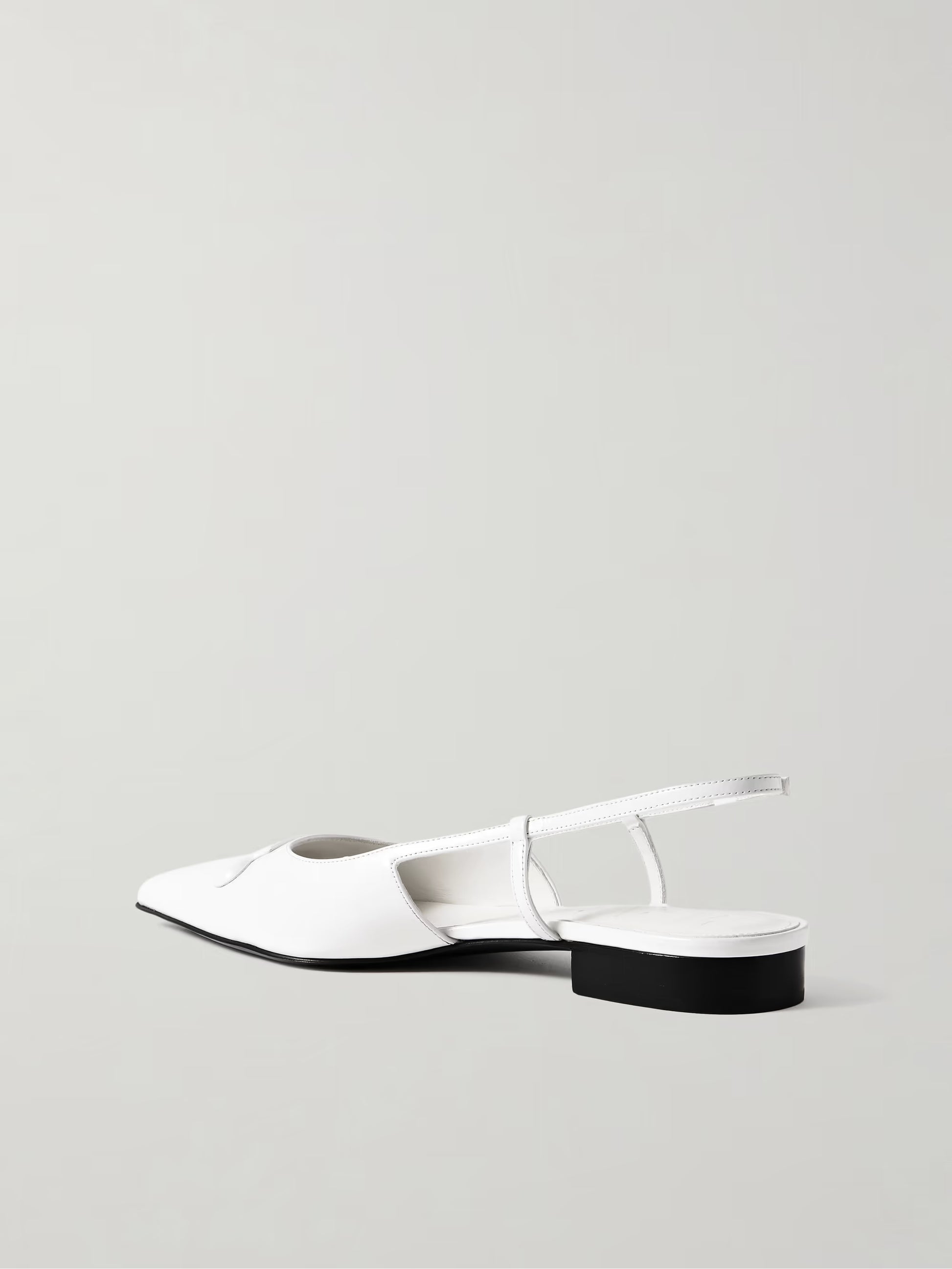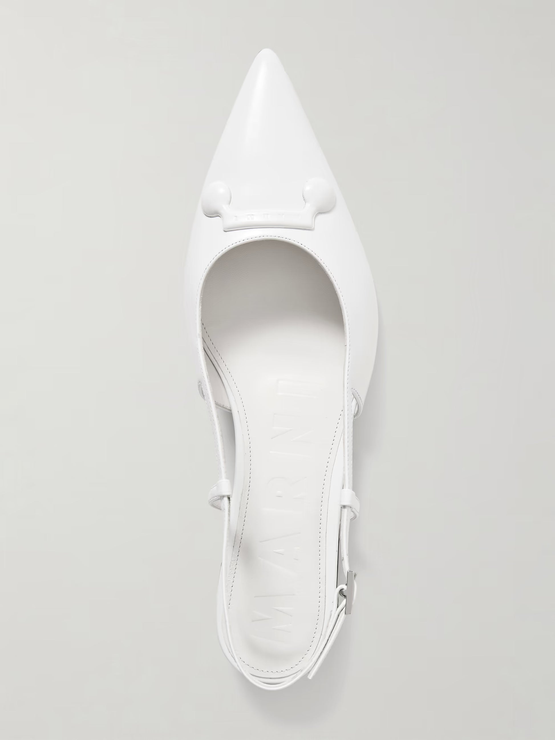 Pointed toe slingback made from polished calfskin leather. Monoblock leather sole. Adjustable strap with silver buckle. Detailed with a high-frequency embossed detail on the toe that reinterprets Marni's iconic Trunkaroo clasp. Made in Italy