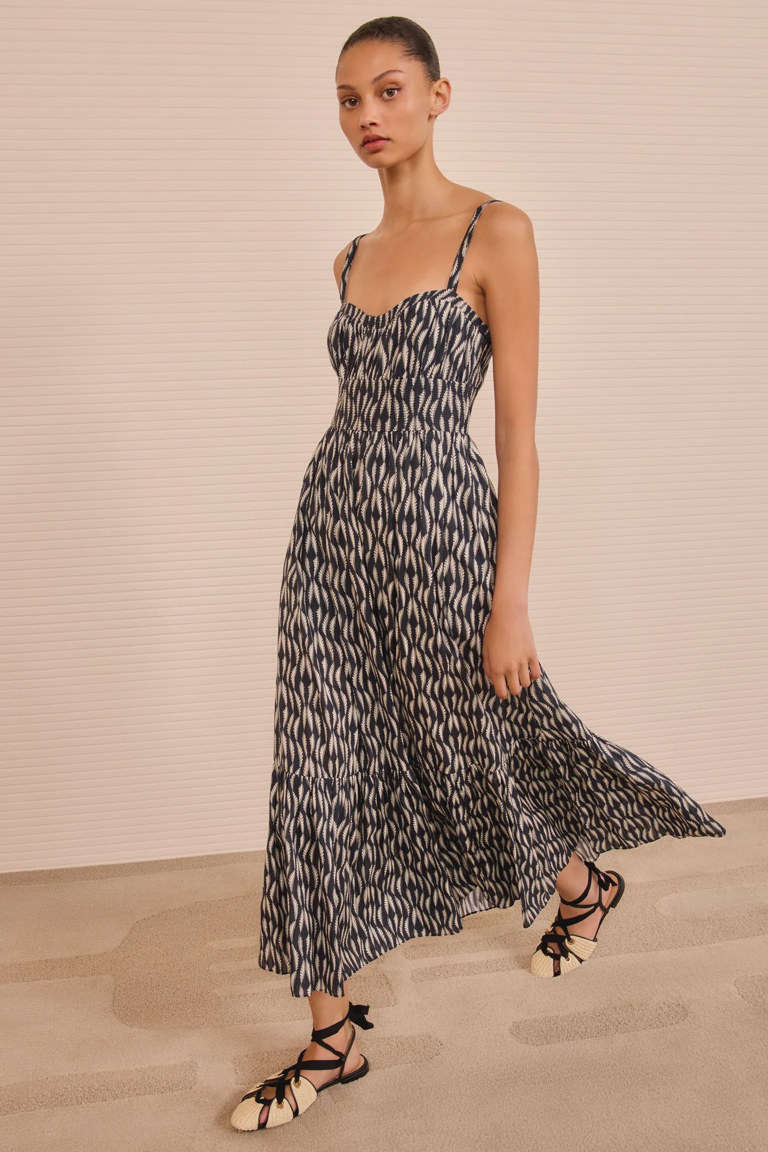 The Nadine midi dress is cut from a breathable cotton blend and features a structured bodice and a ruffle hemline.