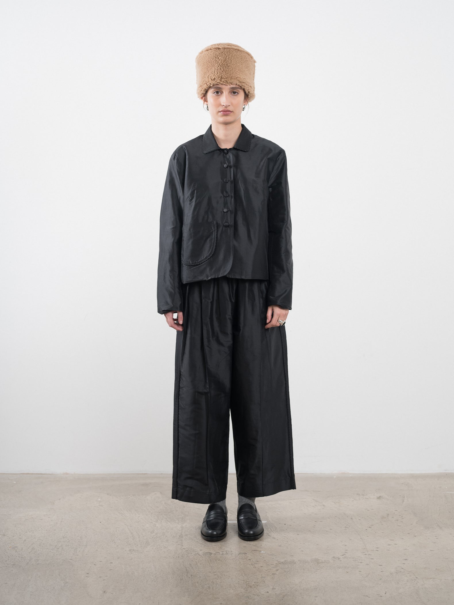 A cropped jacket cut from lightweight silk Dupion and highlighted with a matching black embroidered trim. Features a rounded patch pocket. Silk covered button-front closure and a classic pointed collar.